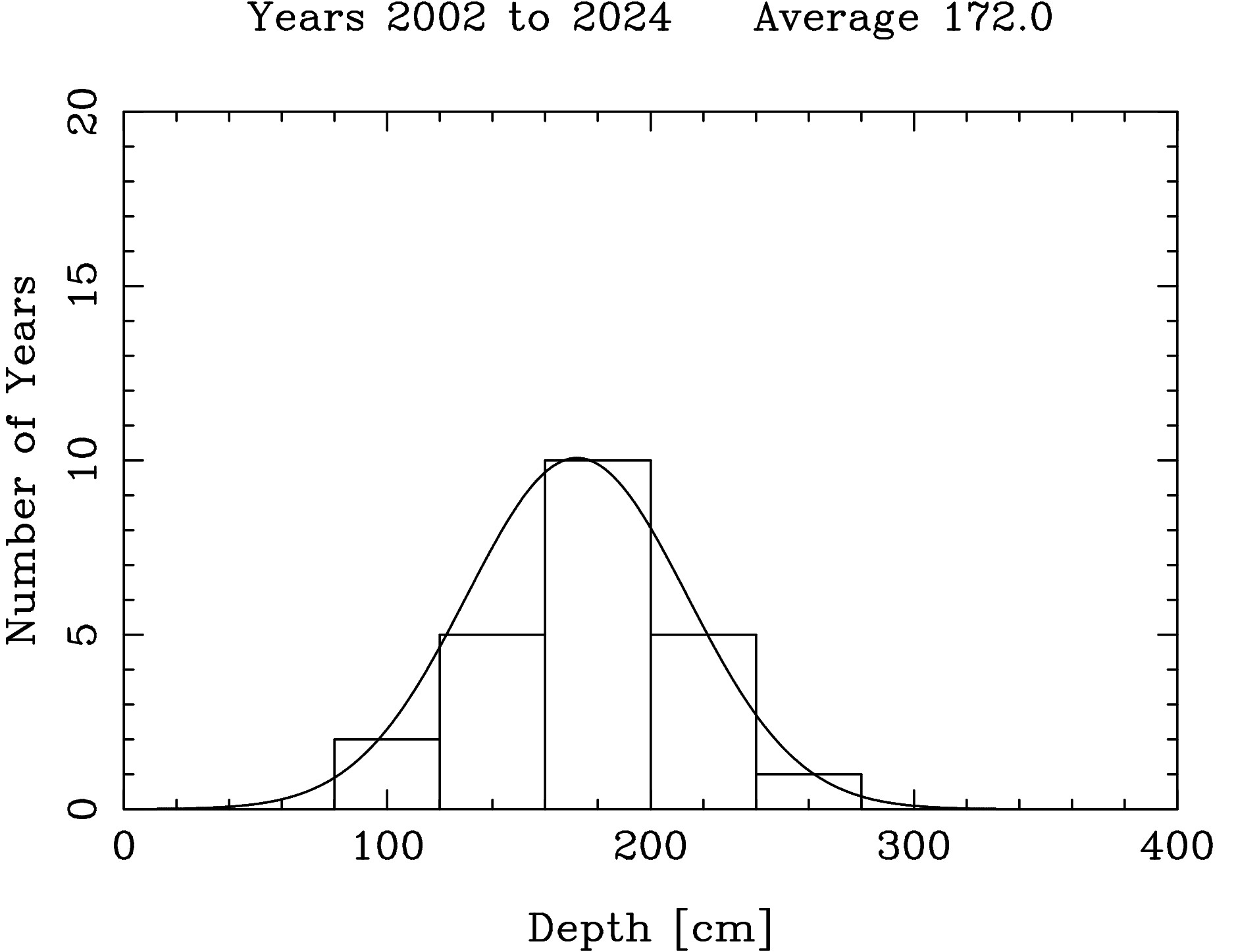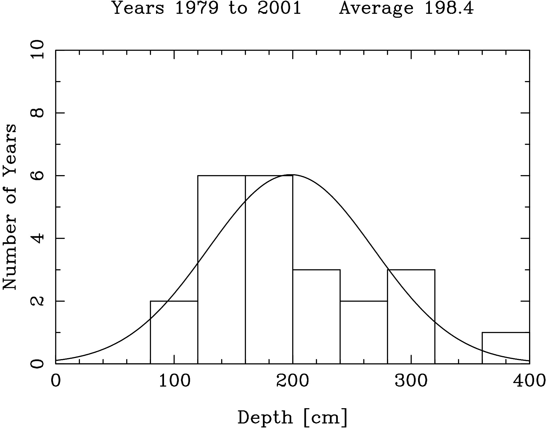3 meters. Fewer years had maximum snow depths above 3 meters in the